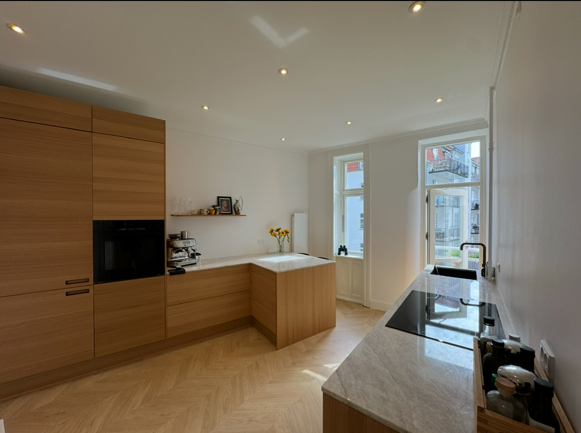 Lejligheden er renoveret i slut 2023 start 2024, og står med helt nyt køkken fra Svane hvor der ikke er sparet på de gode materialer. Badeværelset er også nyrenoveret. Der er lagt nyt gulv og alt el er fræset ind i væggene.